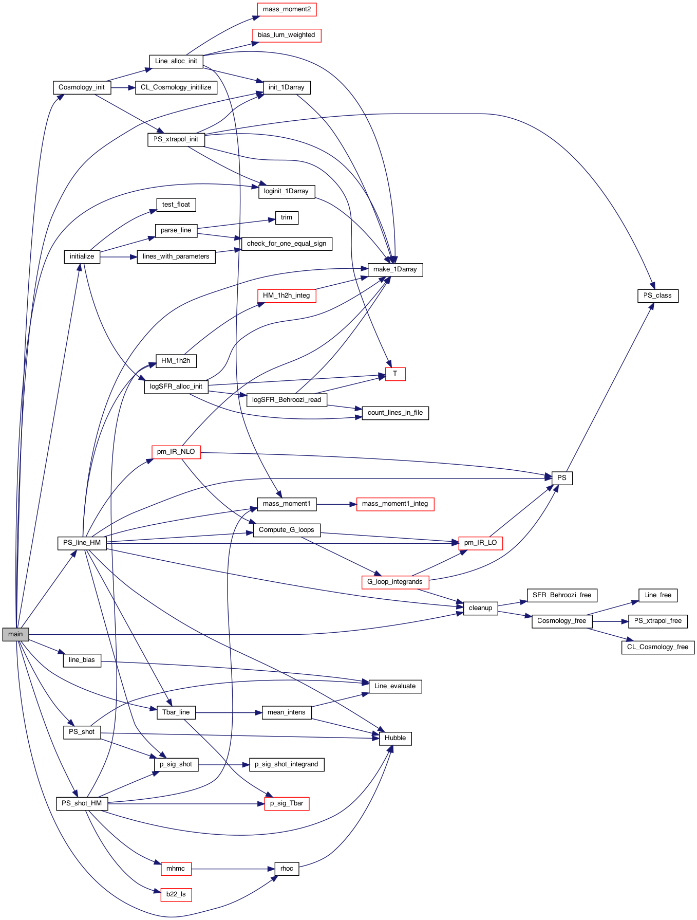 Documented main module, including functions to initilize and cleanup the cosmology structure and calls to fthree main functions to compute the line mean brightness temprature, linear and quadratic biases and clustering and shot contributions to line power spectrum.